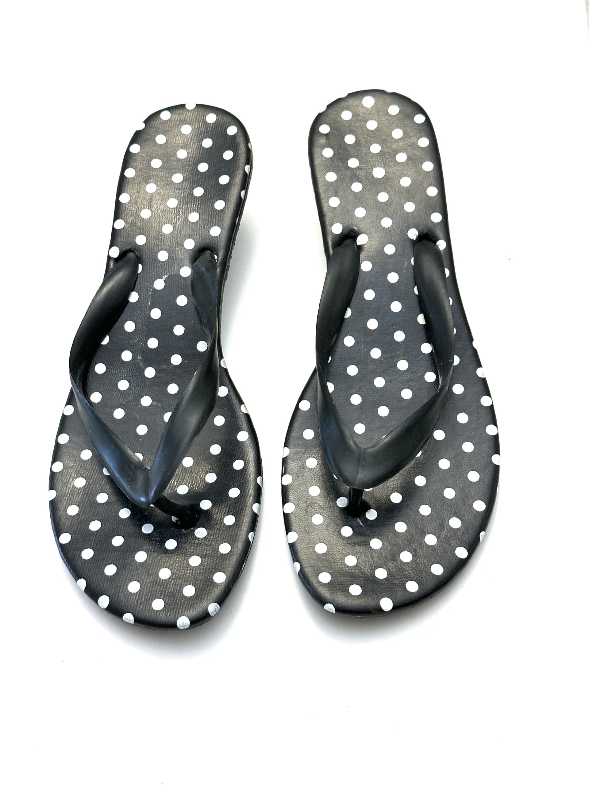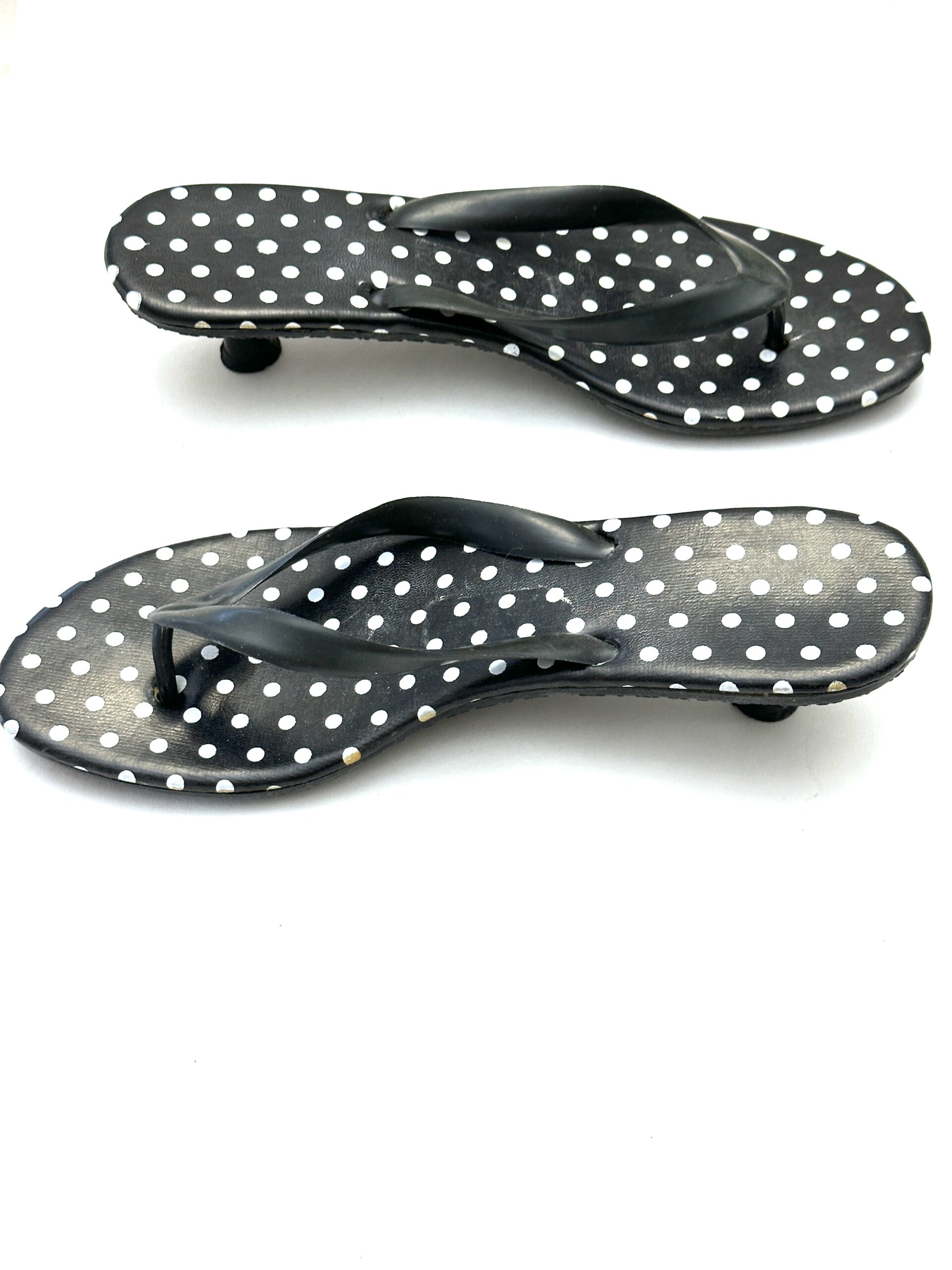 Kitten Heel Black & White Polka Dot Print Flip Flops. Plastic