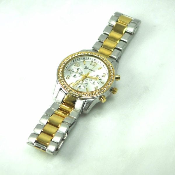 Two Tone – Silver Stainless Steel With Round Cubic Zirconia Face. Looks Exactly Like a Fine Watch. Great for traveling!!